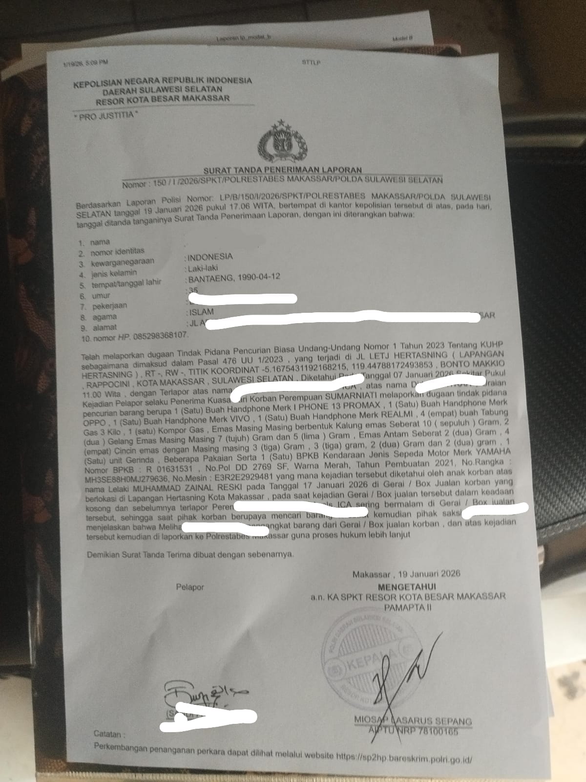 Peristiwa tersebut diketahui terjadi pada Rabu, 7 Januari 2026, dan telah dilaporkan secara resmi pada 19 Januari 2026 dengan Nomor Laporan Polisi: LP/B/150/I/2026/SPKT/Polrestabes Makassar/Polda Sulawesi Selatan.