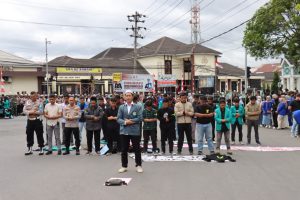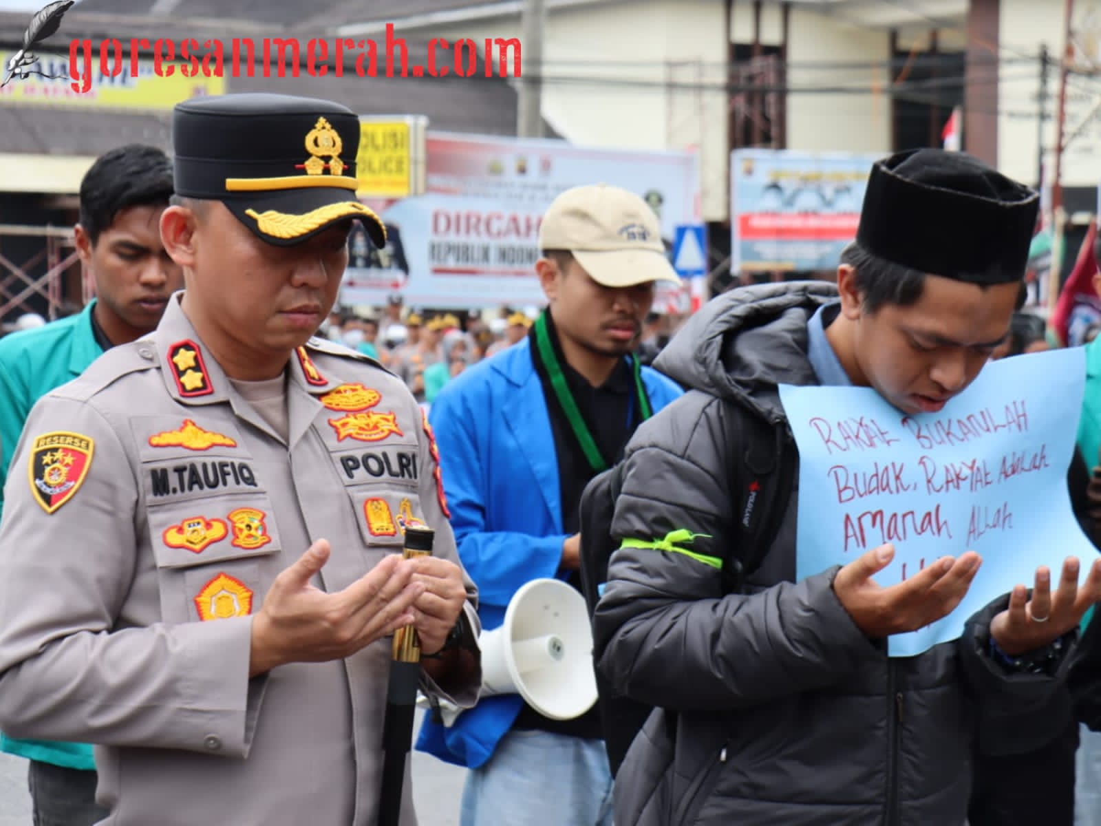 Dengan penuh sikap humanis, Kapolres menyambut kedatangan mahasiswa, mendengarkan aspirasi, dan mengimbau agar orasi disampaikan dengan tertib dan damai.