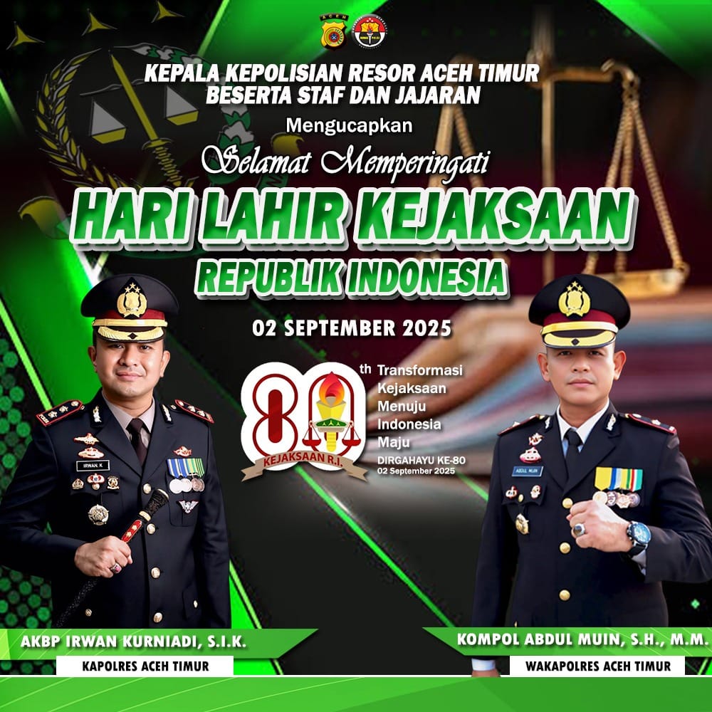“Selamat Hari Lahir Kejaksaan RI yang ke – 80 Tahun 2025, semoga Kejaksaan Republik Indonesia semakin jaya dan profesional dalam menjalankan tugasnya untuk menegakkan supremasi hukum di negeri ini. Kami, dari Kepolisian Resor Aceh Timur, terus siap bersinergi dengan Kejaksaan Negeri Aceh Timur dalam penegakkan hukum,” ujar Kapolres, Selasa, (02/09/2025).