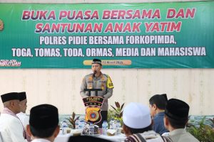 GORESANMERAH.COM | PIDIE – Dalam rangka mempererat silaturahmi serta meningkatkan kebersamaan di bulan suci Ramadhan 1447 Hijriah, Polres Pidie menggelar kegiatan buka puasa bersama dan pemberian santunan kepada anak yatim bersama unsur Forkopimda, tokoh agama (Toga), tokoh masyarakat (Tomas), tokoh adat (Toda), organisasi kemasyarakatan (Ormas), insan pers serta mahasiswa, Jumat (13/03/2026).