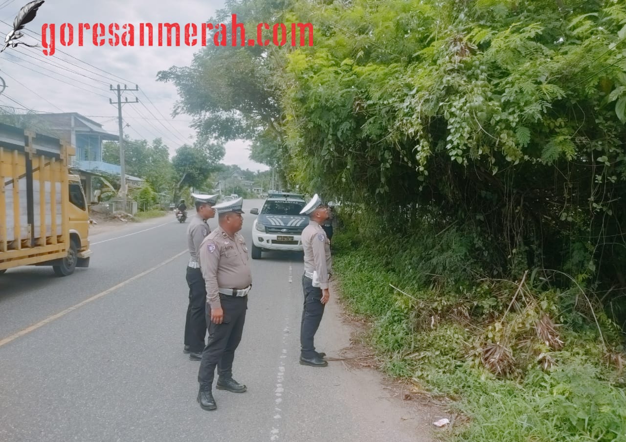 GORESANMERAH.COM | ACEH UTARA – Menindaklanjuti aduan masyarakat, Satuan Lalu Lintas (Satlantas) Polres Aceh Utara turun langsung meninjau lokasi sebuah pohon yang tumbuh miring ke badan jalan di kawasan Gampong Meunasah Alue Drien LB, Kecamatan Lhoksukon, Kabupaten Aceh Utara, pada Selasa (4/11/2025).