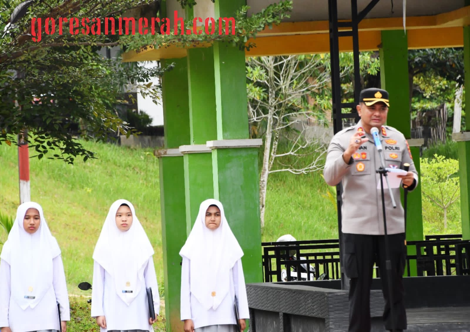 GORESANMERAH.COM | ACEH TIMUR – Dalam rangka program “Saweu Sikula”, Kapolres Aceh Timur, Polda Aceh, AKBP Irwan Kurniadi, S.I.K. bertindak sebagai pembina upacara bendera di MAN Insan Cendekia Aceh Timur, pada Senin (15/09/2025), pagi. Upacara yang berlangsung di halaman sekolah tersebut diikuti oleh Kepala Sekolah, dewan guru dan staf serta seluruh pelajar MAN Insan Cendekia.