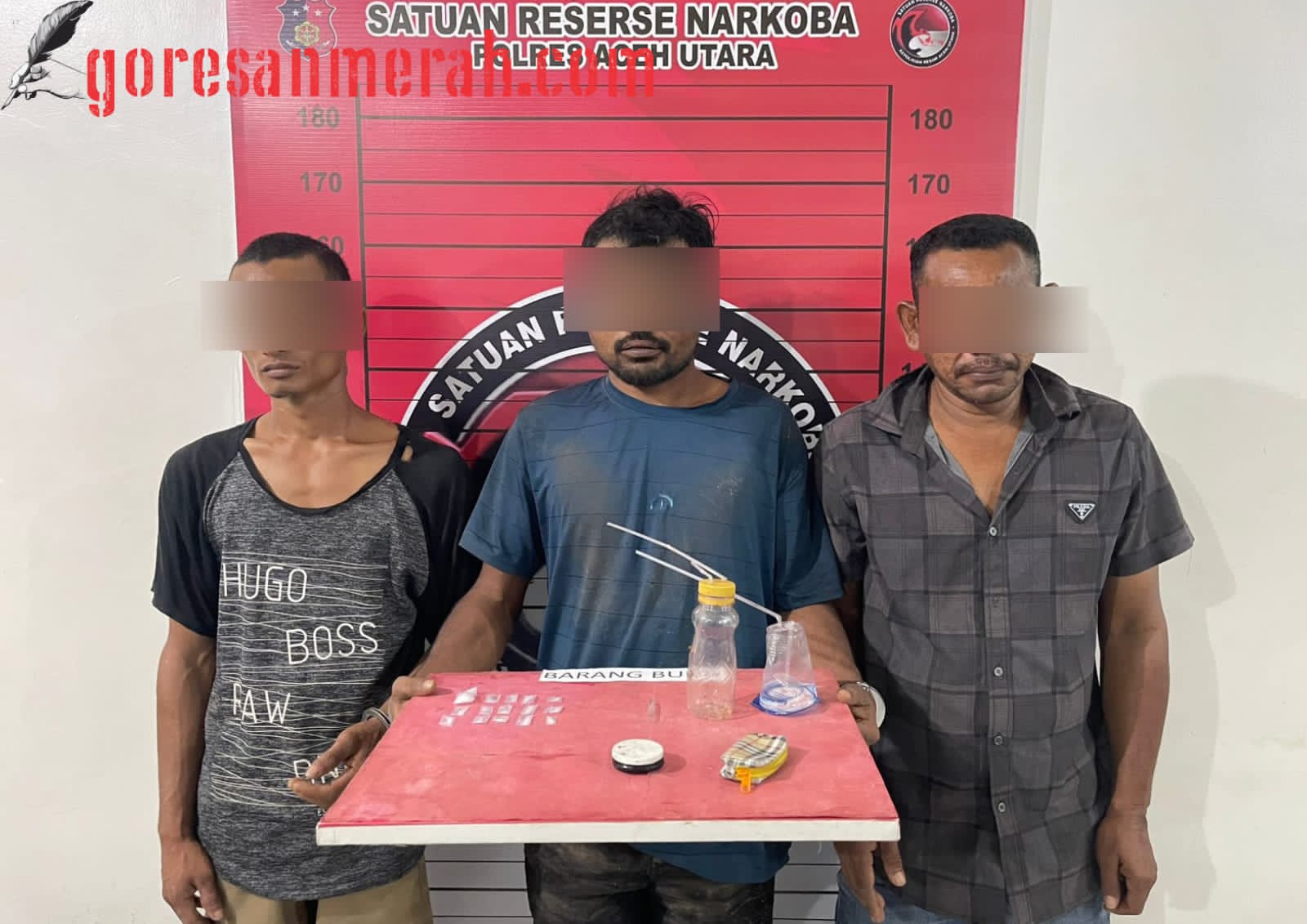 GORESANMERAH.COM | ACEH UTARA – Polres Aceh Utara kembali menorehkan prestasi dalam upaya pemberantasan peredaran narkotika. Melalui Satuan Reserse Narkoba, petugas berhasil mengungkap kasus penyalahgunaan narkoba jenis sabu dengan menangkap tiga pria dan menyita 15 paket sabu siap edar seberat 2,87 gram.